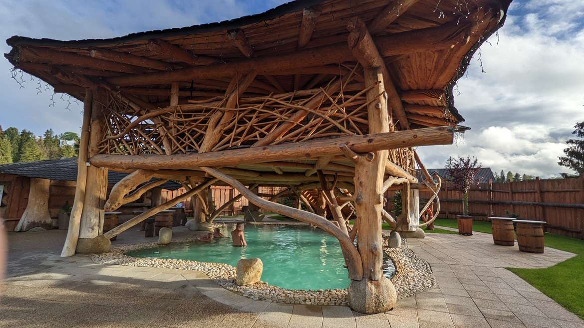 Nicméně, i ve zdejším areálu si můžete vychutnat alko či nealko drink u dřevěného baru přímo v teplé vodě termálního bazénu.
